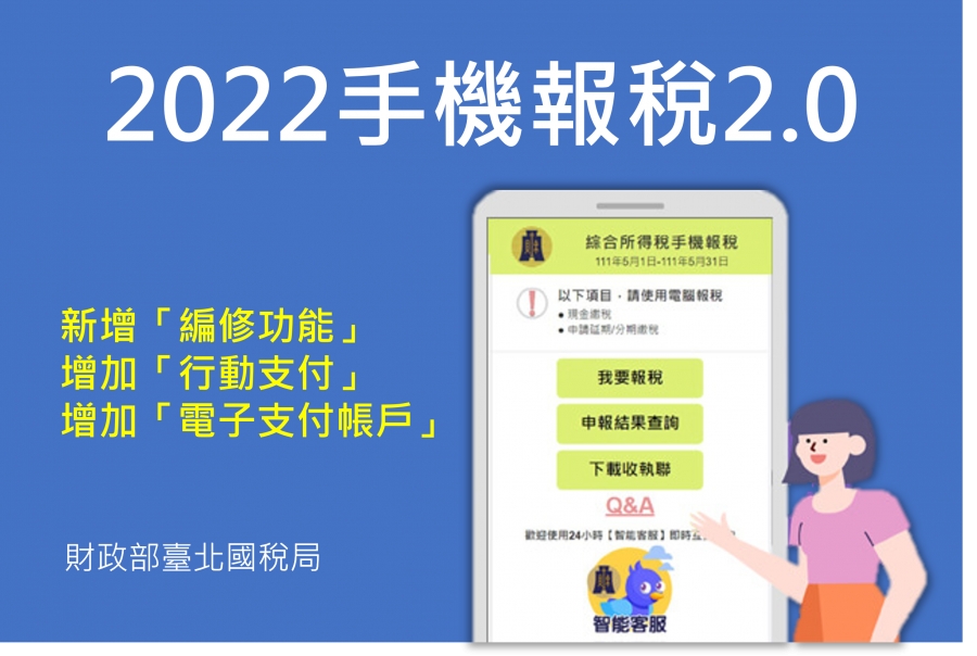 財政部臺北國稅局表示,110年度綜合所得稅結算申報,升級推出「手機報稅2.0」服務,新增「編修功能」及增加「行動支付、電子支付帳戶」繳稅方式,以符合更多報稅族群的需求,免臨櫃免群聚好便利,使用手機即可e指搞定報稅。